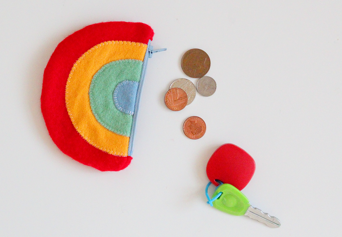 So we thought we would make a little colourful purse for our littlens as they love nothing better than to play shops (meets vet/hairdressers/cafe…). It’s really easy to make with just a zip and some felt. We love felt – you don’t have the finish the edges, it’s inexpensive and nice and bright. We used a sewing machine but you could easily sew these by hand if you like – it will just take you a bit longer.