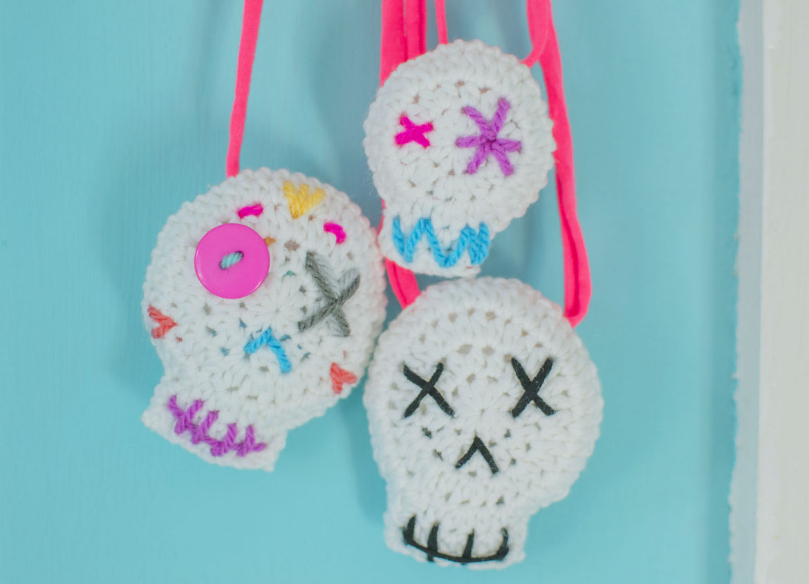 You are then free to experiment, I made a smaller one by missing off a round and used a button for an eye as well as more colourful yarn on the others. You can add as much detail as you like to make them look like sugar skulls, or just stick with black for a more simple look.